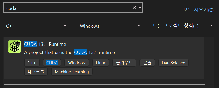CUDA Toolkit이 정상적으로 설치되면 Visual Studio에서 프로젝트 생성시 템플릿을 사용할 수 있다.
